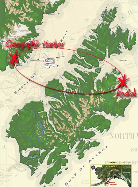 The tour starts off in Kodiak city, where you will board one of Kingfisher’s Bush Hawk or Beaver Floatplanes. Before the trip you will be outfitted with a pair of hip boots and a rain jacket at our hangar / office. The flight will take you West to the Katmai Coast on the Alaska Peninsula. This is about an hour flight and your aircraft will pass by the village of Ouzinkie, mountains, islands and bays. Ocean waters can be active with finback or humpback whales. Your pilot will narrate along the way on the voice activated headsets, pointing out interests along the way. The pilot will splash down the floatplane in one of the saltwater bays – most likely in Geographic Harbor or Kinak Bay.